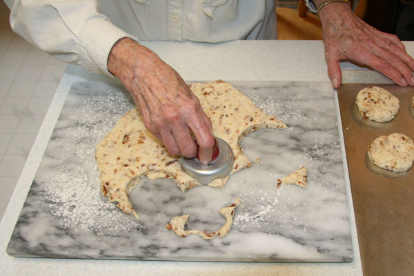 Making Bacon Biscuits 20. Use Biscuit Cutter We use our biscuit cutter to cut the dough into the 2 1/2 inch round biscuits. Pushing down and lightly but firmly twisting will free the biscuit. Shaking it over the ungreased cookie sheet frees it onto the cookie sheet. The pieces left over after cutting the biscuits will be reformed into a ball and rolled again. The cookie sheet should be shiny so they won't burn on the bottom before the rest bakes. ⇦ Back to Step 19 On to Step 21 ⇨Return to Bacon Biscuits - Page 3 |