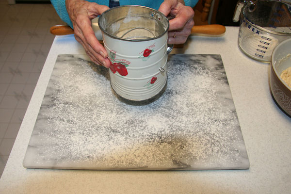 Making Butterscotch Swirl Biscuits 8. Flour Board We put a little flour in our flour sifter. Holding it over our rolling table we lightly tap the side to dust the rolling table surface. Our son gave Paul this marble table and roller as a gift one Christmas. We will also dust flour on Bernice's hands so she can handle the dough without sticking. ⇦ Back to Step 7 On to Step 9 ⇨Return to Butterscotch Biscuits - Page 1 |