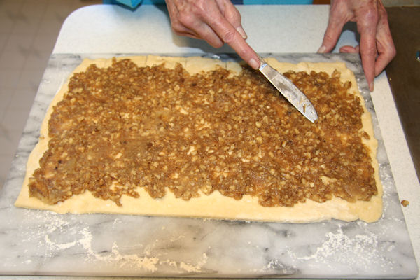 Making Butterscotch Swirl Biscuits 20. Spread Topping We poured the cooled topping mixture onto the dough rectangle. Using the flat of a kitchen knife we spread out the topping evenly. You want to go near the narrow edges but leave space on the long edges. If you look closely at the top you can see where I marked each of the 2 inch strips to be cut. ⇦ Back to Step 19 On to Step 21 ⇨Return to Butterscotch Biscuits - Page 3 |