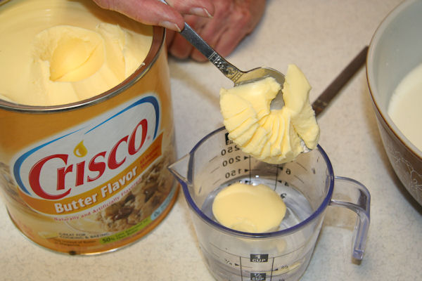 Making Fluffy Cornbread 13. Measure Soft Shortening We fill a 1 cup measuring cup with 3/4 cup of cold water. We begin to add spoonfuls of soft shortening to measuring cup with the water to bring the water up the 1 cup level . That will give us a 1/4 cup of soft shortening. ⇦ Back to Step 12 On to Step 14 ⇨Return to Fluffy Cornbread - Page 2 |