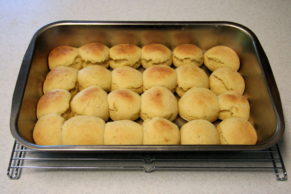 Making Easy Dinner Rolls 24. Finished Rolls Here you can see our finished "Easy Dinner Rolls." They smelled so good we had to try a couple while still warm. They tasted delicious. We stored the rest in a covered tin in the refrigerator. Later when we wanted some we warmed them in the microwave for about 8 seconds per roll. ⇦ Back to Step 23 On to Step 1 ⇨Return to Easy Dinner Rolls - Page 3 |