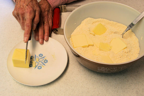 Making Crisp Cornmeal Scones 9. Slice Butter We need 1/2 cup of butter (1 Cube). Mixing the butter into the dry ingredients will be much easier if the butter gets cut into pieces. So we use a small sharp knife to cut the cube of butter into slices. As we sliced the butter we put the pieces into the flour bowl. ⇦ Back to Step 8 On to Step 10 ⇨Return to Crisp Cornmeal Scones - Page 2 |