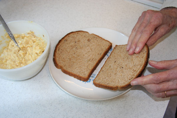 I like to lay out the bread so that the slices match. Each slice varies slightly by size to we try to keep adjacent slices matched up.
