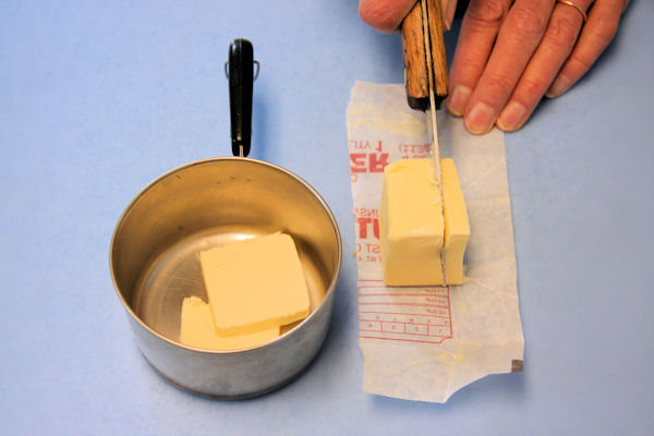 We slice the butter into our small pan. Slicing will allow it to melt faster but is not vital.