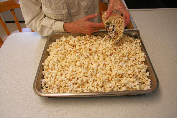 Add the Peanuts Now Bernice adds the peanuts to the popped caramel-popcorn. We used a package of raw Virginia peanuts. You could also add other kinds of nuts, pecan, macadamia, or cashew in addition or in substitute. All of the nuts should be unsalted. Of course, you can just omit the nuts altogether if desired or necessary. ⇦ Back to Step 3 On to Step 5 ⇨Return to Caramel Popcorn - Page 1 |