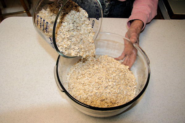 We measure out 6 cups of oats and put them into a large bowl. Use rolled oats not quick-cooking or instant oats.