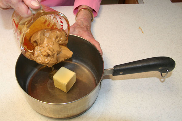 We pour the measuring cup of honey and peanut butter into the sauce pan with the butter.
