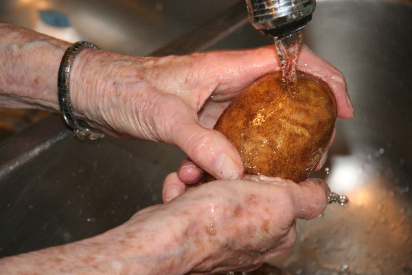Scrub the Potatoes While Paul was chopping onions Bernice scrubbed the potatoes. Use your hand or a brush. You just want to get most of the dirt/dust off the potatoes. After Paul peels the potatoes Bernice will wash them once more. ⇦ Back to Step 5 On to Step 7 ⇨Return to Potato Soup - Page 1 |