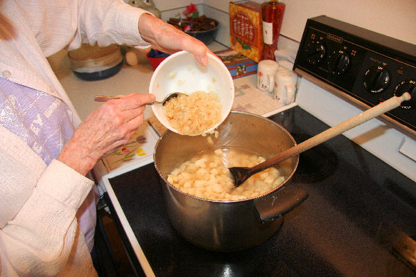 We now add the chopped sautéed onions to be heated up with the potatoes.