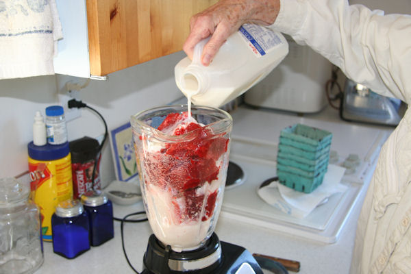 Add Milk Next Bernice add some milk. We used 2% but use what you like to use. You need enough milk to allow blending but still keep the liquid thick. If the blender can't keep the liquid moving we will add more milk. Too much milk will make the shake thin. ⇦ Back to Step 4 On to - Step 6 ⇨Return to Making Strawberry Milkshakes |