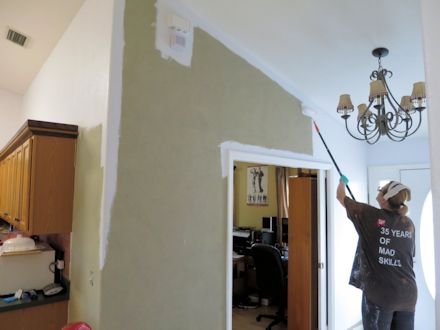 We Paint our Ground Floor Walls - Page 19 Paint Entryway with Rollers Sandy now finishes the entryway with the rollers. She has rolled away the scaffold and does all of the roller painting from the floor using the extension handle. ⇦ Back to Page 18 Return to Page 3 On to Page 20 ⇨Hi Res Pic |