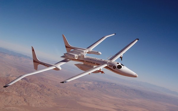 Proteus in flight over mountains near Las Cruces, NM The Proteus is a unique aircraft designed as a high-altitude, long-duration telecommunications relay platform, with potential for use on atmospheric sampling and Earth monitoring science missions as well. It was designed by Burt Rutan, president of Scaled Composites, and built during 1997-98 at the firm's development facility in Mojave, CA. Normally flown by two pilots in a pressurized cabin, the Proteus also has potential to perform its missions semi-autonomously. The aircraft is designed to cruise at altitudes from 50,000 to more than 63,000 feet for up to 18 hours. Proteus' small cabin is pressurized to allow the flight crew a shirt-sleeve environment equivalent to an altitude of 14,500 feet when the aircraft is at 55,000 feet, or 15,500 feet at a 60,000-foot altitude. Hi-Res Pic (74K) |