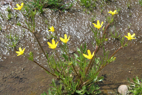 Flowers Growing at our Home Swamp Buttercup Rannunculus occidentalis Common, early to midspring, perennial, 3-30 in. Upright, usually branched, hollow stem with soft hairs. Basal leaves with 1-3 in. petioles, softly hairy, oval to heart-shaped, divided deeply or shallowly; stem leaves alternate, more deeply divided. Flowers top plant, 1/3-11 in. wide, yellow, 5-6 petals each about 1/2 as wide as they are long. Grows in moist soils, meadows, coastal bluffs, forests, from sea level to high elevations. Ours grow along side the driveway in a drainage ditch. ⇦ Back to Previous Flower On to Next Flower ⇨Hi-Res Pic (227K) Hi-Res Pic Flower (98K) |
