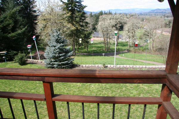 Nolls Oregon Home in 1996 11. Looking North from the Hot Tub Now the satellite dish is gone. We now have a rock wall to contain the lawn that had been slipping down the hill. Trees have been planted and bird nests installed. Feeders have been placed for our fine feathered friends. You can also get a good view of the new railing designed by our son Chet. You can see big improvements in our pictures as we use an excellent camera with much better control over the exposure. Hi-Res Pic (224K)Return |
