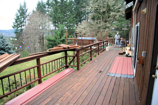Construction Hot Tub Cover New Cover Parts - 3 Mike moved all of the things we need for the new top on his trailer and the two of us have moved them to the deck to begin the new top. On the right is the metal roofing. In front of that are the timbers and lumber for the top. The cap lies on the near left out of the way. Some of the pieces from the removal of the old top sit parked on the railing. ⇦ Back to Page 2 On to Page 4 ⇨Hi Res Pic (204K) Return to Hot Tub Cover - Page 1 |