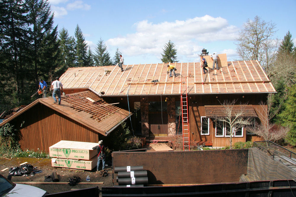 Plywood Carried Up - 21 - Most of the 1X4 strips have been put into place and being nailed by air nailers.