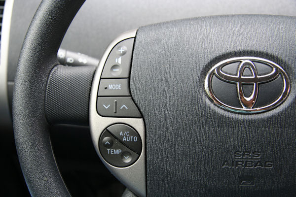 Paul Noll's 2009 Toyota Prius Left Steering Wheel Controls - 27 We especially enjoy the convenience of the controls on the left side of the steering wheel. The top buttons + and - control the volume of the radio. If the radio is turned off the mode button will turn it on. If the radio is on holding it pressed will turn it off. If the radio is on pressing the mode will switch from AM to FM and the reverse. Then pressing the up or down symbols will change stations. The buttons below will turn on or off the air conditioning. The temp buttons will adjust the temperatures up or down. ⇦ Back to Page 26 On to Page 28 ⇨Hi Res Pic (180K) Back to Page 4 Thumbs |