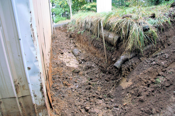 Shop Improvement Project 4 Mud on East Side This shot looks back on the east side from the south. Shortly after this shot the wall at this end collapsed and we had to clean up the mess. A couple of friends sawed up the logs and we moved the dirt so we could work. The drain pipe shown comes from the RV building 50 yards off to the east. Shortly after the dozer/back hoe work was done rain turned the whole site into a muddy mess. We were forced to wait for dryer weather to continue. Hi-Res Pic (266K) |