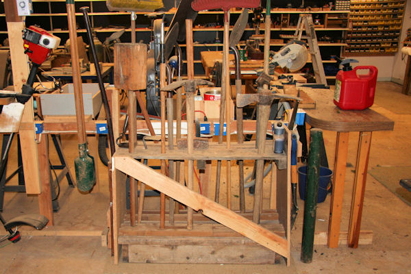 14. Garden Tool Rack I got tired of having the shovels, rakes, hoes and other tools piled up in a corner or falling on the floor. I built this rack to store neatly the garden tools. Picks, power whips, all conveniently stored in their own place. Hi-Res Pic (264K) |