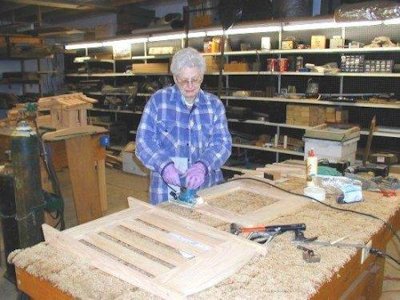 1. Bernice Sanding a Oak Glider Chair After Paul cuts out the parts to the chair, Bernice sands the pieces. First she uses fine sandpaper then finishes with very fine grit sandpaper. She spends many hours getting the wood ultra smooth. We are also making another out of maple. |