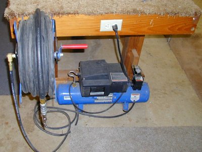 19. Air Compressor A valuable tool in any shop is an air compressor. Paul has installed a winding wheel to store the long hose. Accessories include an air gun and tire inflater. All have quick connecters. Our compressor is a DeVilbiss DFA153. Hi-Res Pic (134K) |