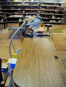 29. 8 1/4 Inch Slide Compound Miter saw This saw is used to make angle and cross cuts. We added a six-foot long table to allow you to cut long boards easily. As you can see each tool is hooked up to the dust vacuum. A gate valve selects which hose is active. We extended the dust hose next to the saw so it can be activated easily. Also a switch for the dust vacuum has been added for ease of use. This saw incorporates a sliding device so it can cut wide boards. Hi-Res Pic (121K) |