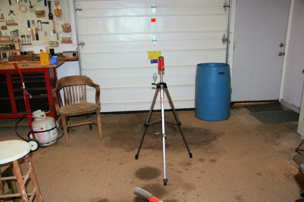 Noll Shop in Pleasant Hill, Oregon 8. Laser Leveler - Sears Craftsman This laser leveler came as a gift from my son Landon. It allows you to plot a line horizontal or vertically or both. It really helped to level the ground around our shop. If you look closely you can see the red line both vertically and horizontally. A switch allows you to choose which one you want or both. The good tripod came with the tool. This unit burnt out after a little use. Better and cheaper units are now available. The rug in the photo is now gone and roof leaks corrected. Hi-Res Pic (145K) |