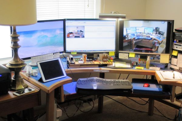 Noll Computer Hardware Our Triple monitors - 2 We use three Acer X223W monitors for easy use. A VisionTek HD5450 512MB VhDCI 3-port SFF DDR3 PCIe card allows you to use three monitors with the mouse able to travel across the three monitors. This allows me to put up the pictures on one screen and my html program on any of the other three screens. The shelf below the monitors gives us a place to sit tools and equipment easily in reach. The monitors go quiet when the computer goes inactive after a certain period of time. ⇦ Back to Page 1 On to Page 3 ⇨Hi-Res Pic (124K) Back to Computer - Page 1 |