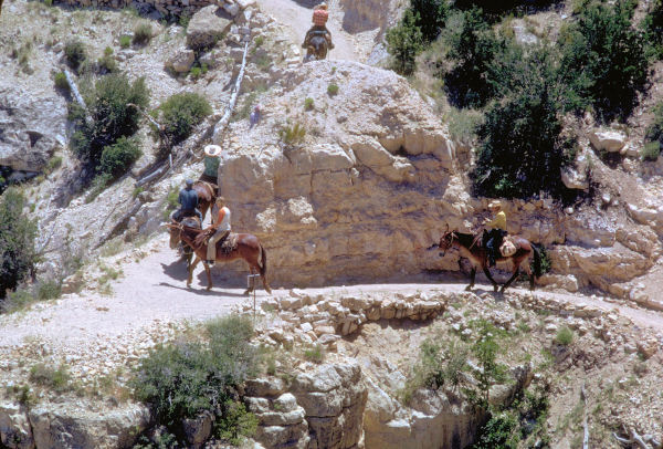 Grand Canyon, Hike to Bottom, Arizona 24. Riding the Mules You can hire an outfit to take you to the Phantom Ranch. Bernice had prepared herself for the trip by putting a $50 bill in her pack. If you need to use the mules to get you out of the canyon it costs $50. No one knew she had done the $50 thing. But she made it out on her own. Mules and up bound hikers have the right-of-way on the trails. ⇦ Back to Page 23 On to Page 25 ⇨Hi-Res Pic (250K) Return to Hike Choices - Page 3 |