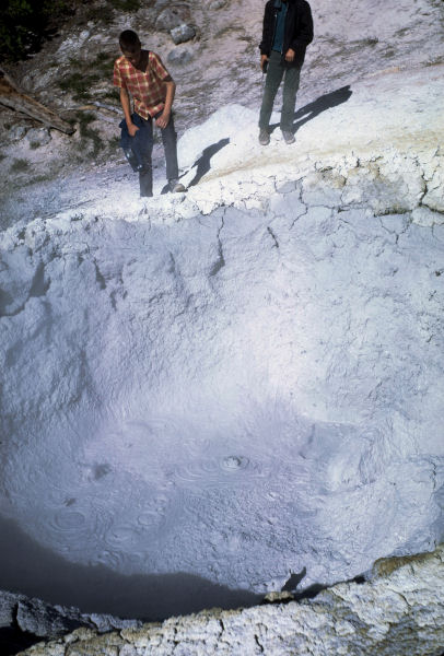 Mount Lassen National Park 26. The lads inspect one of the Many Mud Pots The activity of any mud pot varies depending on the rain and other factors. When wet enough it pot goes "bloop" and mud get flung up in the air. When it gets too dry you just see steam. When they get too wet you just see bubbles. ⇦ Back to Page 25 On to Page 27 ⇨Hi-Res Pic (168K) Return to Mt. Lassen -- Page 4 |