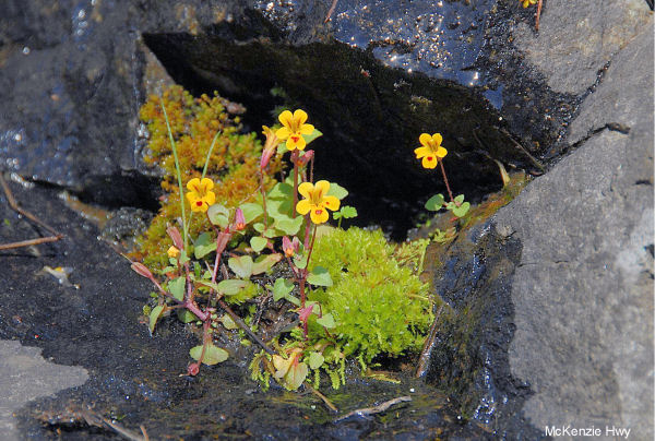 Wildflowers Found in Oregon Chickweed Monkeyflower Mimulus alsinoides - Locally common, late spring, annual, to 6 in. Tiny plant with erect stem. Leaf oval to round. Flower on short stalk; calyx with 2 lower lobes widely rounded, 3 upper lobes smaller, with pointed tips, finely hairy. Flower bright yellow with large red spot on center lower lobe, smaller dots going into throat. Grows in shady places in mosses and moist banks at low to mid elevations. On to Next Flower ⇨Hi-Res Pic (228K) Hi-Res Pic Flower (219K) |