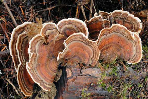 Turkey Tail Mushroom Trametes versicolor The Turkey Tail is one of the most common mushrooms in North American woods, found virtually anywhere there are dead hardwood logs and stumps to decompose--and, occasionally, on conifer wood too. Its cap colors are extremely variable, but tend to stay in the buff, brown, cinnamon, and reddish brown range. The mushrooms are strikingly "zonate" with sharply contrasting concentric zones of color, and the surface of the cap is finely fuzzy or velvety. Often the zones represent contrasts in texture as well as color, so that fuzzy zones alternate with smoother ones. Fruiting Body: Up to 10 cm across; only a few mm thick; flexible when fresh; circular, semicircular, bracket-shaped, or kidney-shaped; densely hairy or velvety, often with alternating zones of texture; with concentric zones of white, brown, cinnamon, and reddish brown (but highly variable in color and sometimes with other shades, including blue, green, and orange). On to Next Flower ⇨ |